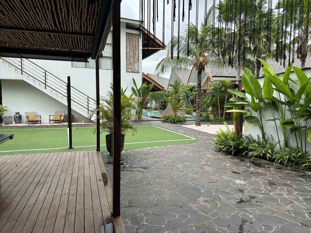 - Outdoor game area featuring shuffleboard, billiards, ping pong, and turf badminton court.